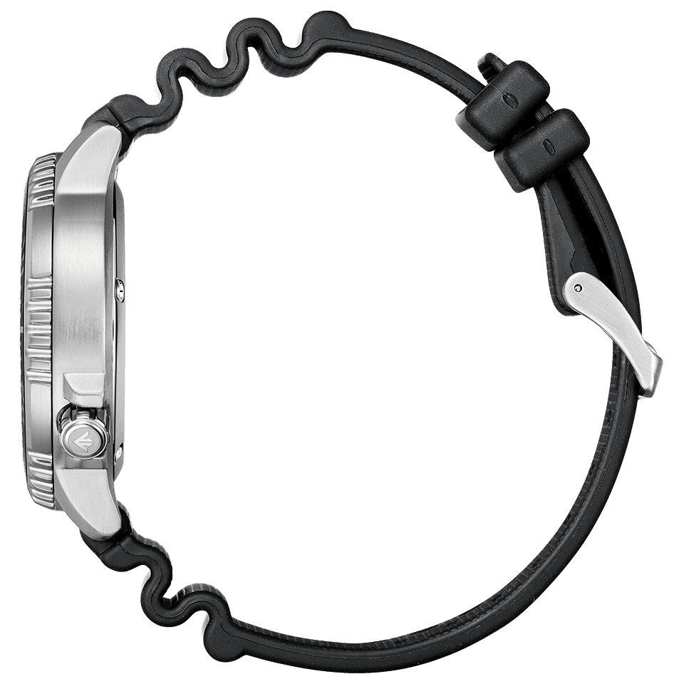 腕への装着性を考慮し、手首に干渉しづらい4時位置にりゅうずを配置。